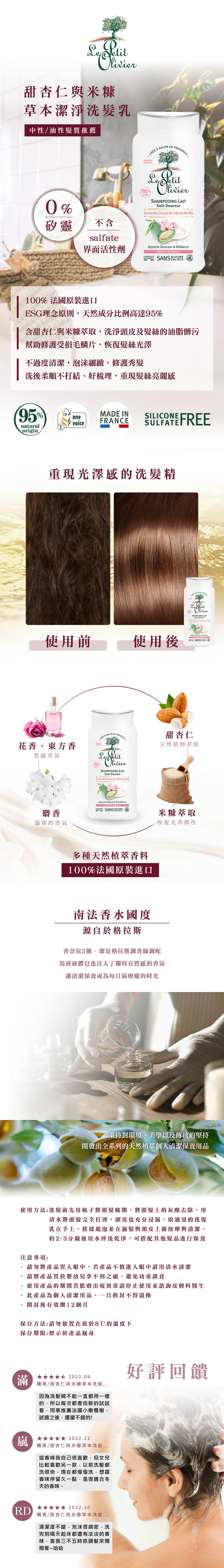 1. 推薦一般髮質使用 2. 含甜杏仁與米糠萃取,洗淨頭皮及髮絲的油脂髒污 3. 不含salfate表面活性劑、不含矽靈 4. 不過度清潔,泡沫細緻, 5. 髮絲柔順亮麗,洗後不乾澀 6. 100%法國原裝進口 7. 容量: 250ml